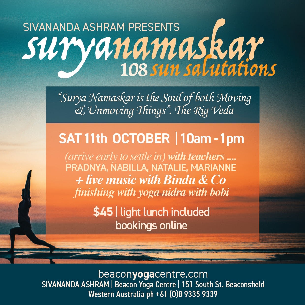 We invite you to spend a Saturday morning Saluting the Sun followed by a light lunch. Our teachers will guide you through 108 Sun Salutations. Each taking you safely through 27 rounds using different variations of Surya Namaskar to live music.